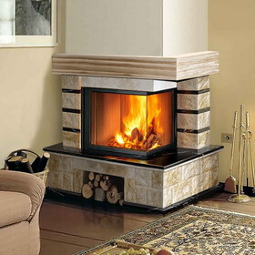 Каминная облицовка ЭкоКамин Ландыш угловой, Negro Marquina, балка ясень