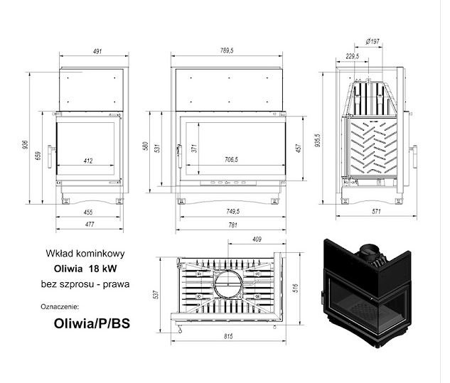 Инструкции, чертежи, документы - Каминная топка Kratki Oliwia/P/BS (угловое стекло справа)