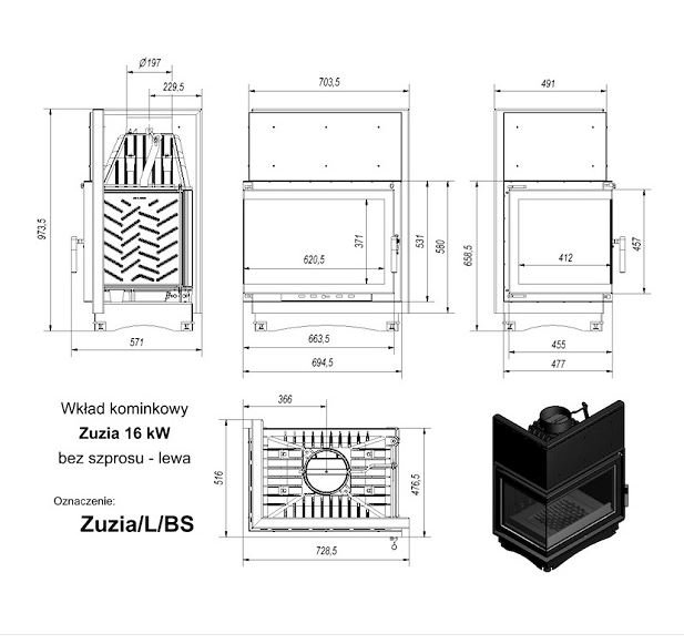 Инструкции, чертежи, документы - Каминная топка Kratki Zuzia/L/BS (угловое стекло слева)